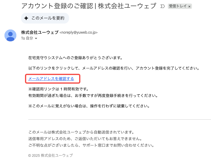 入力したメールアドレス宛に届く「アカウント登録のご確認|株式会社ユーウェブ」という件名のメールを開きます。