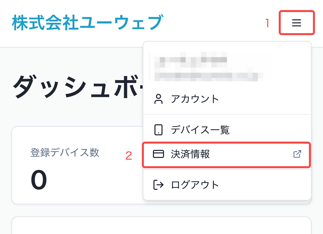 ログインし、画面右上のメニューボタンを押して、[決済情報]を選択します。