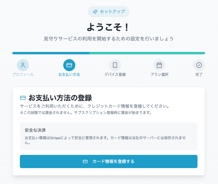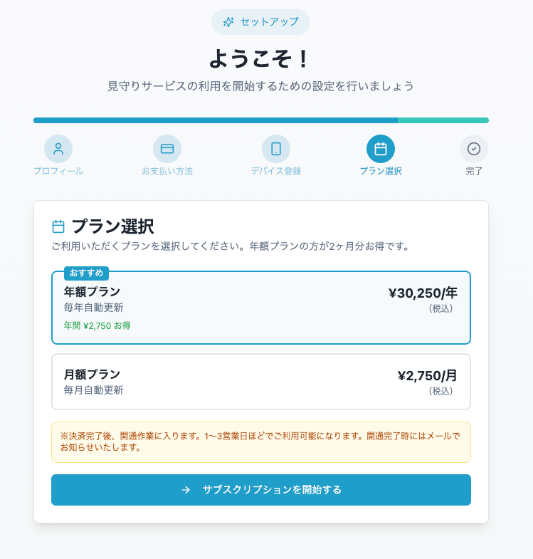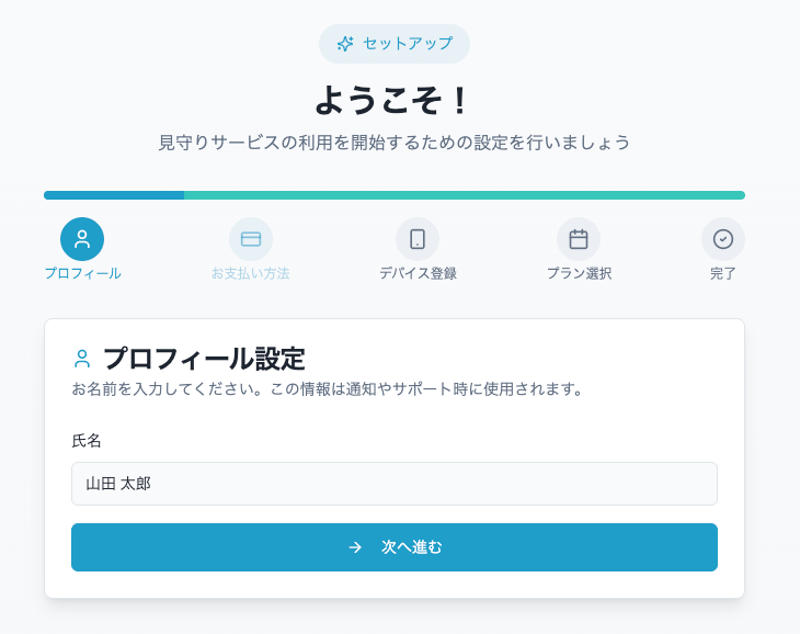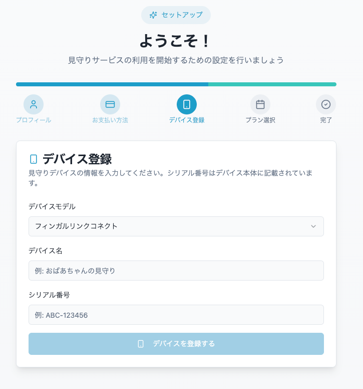 1. アカウントを作成するアカウントの作成方法2. 氏名を登録するお客様の氏名を入力してください。3. 決済情報を登録する4. デバイス情報を登録するフィンガルリンクコネクト(型式:FU6823)のシリアルナンバーの確認方法5. サブスクリプション登録を行う手続き完了です。1〜3営業日以内に開通いたしますので、それまでお待ちください。